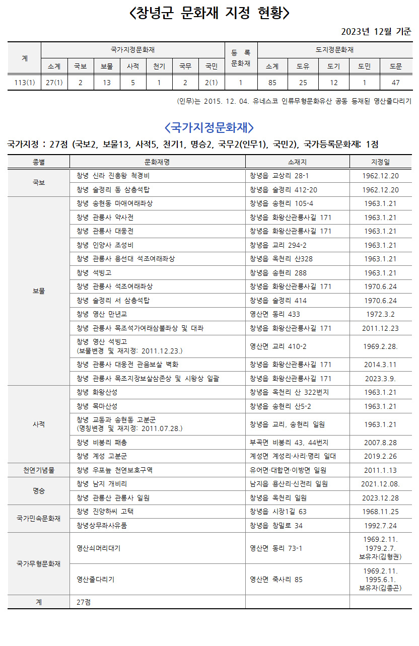 â³ç±º ¹®ÈÀç ÁöÁ¤ ÇöȲ 2023³â 12¿ù ±âÁØÀÚ·á.hwp