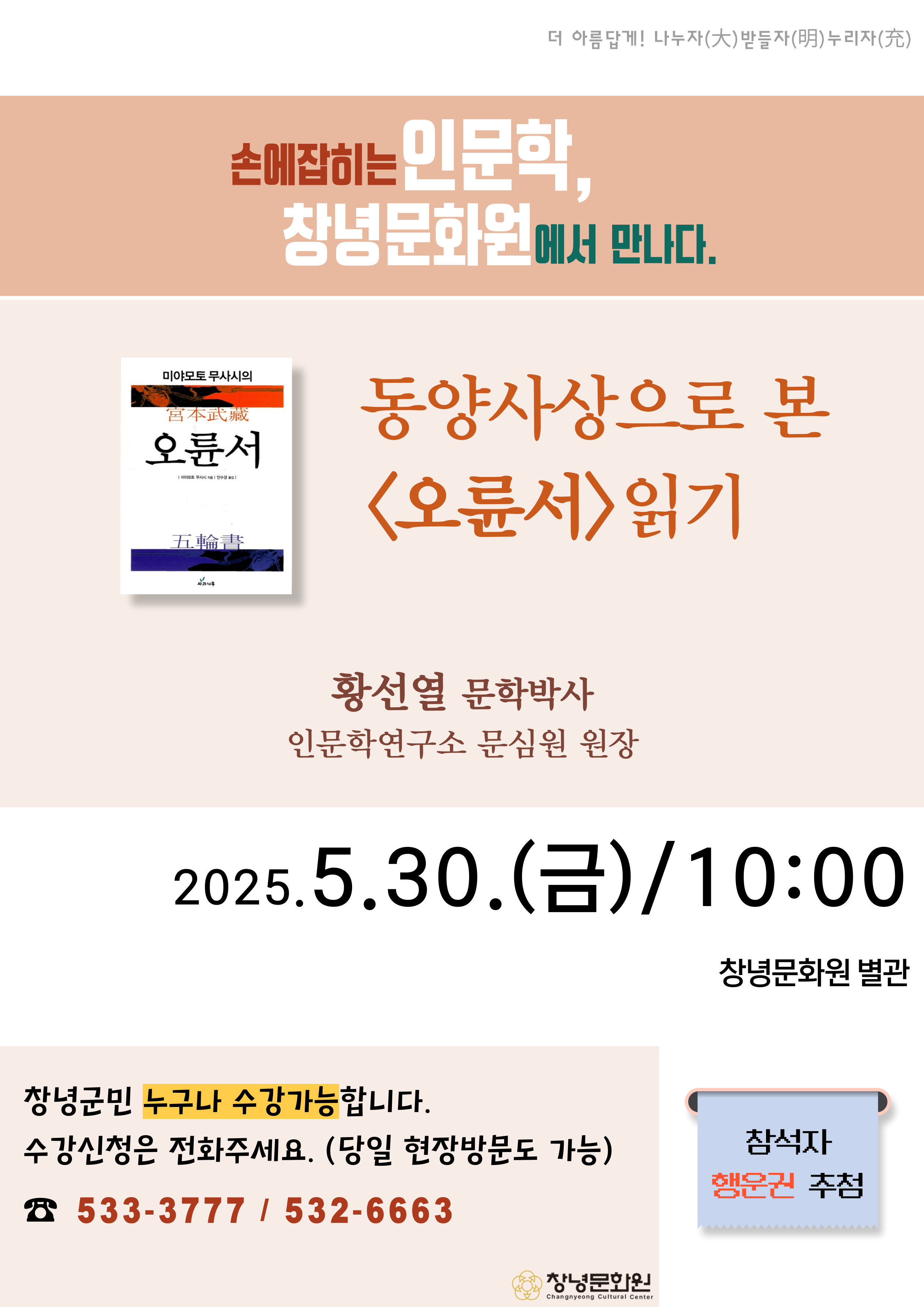 <¼Õ¿¡ ÀâÈ÷´Â Àι®ÇÐ, â³ç¹®È¿ø¿¡¼ ¸¸³ª´Ù!>2025³â 5¿ù 30ÀÏ(±Ý) 10½Ã¿¡ Àι®ÇРƯ°ÀÌ ¿¹Á¤µÇ¾î ÀÖ½À´Ï´Ù.¼ö°½ÅûÀº ¹®È¿øÀ¸·Î ¹æ¹® ¶Ç´Â ¿¬¶ôÁÖ¼¼¿ä. ´çÀÏ Á¢¼öµµ °¡´ÉÇÕ´Ï´Ù.